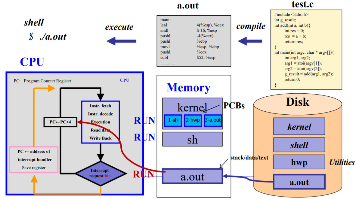 우리가 코드를 짜서 실행하면, 실제로는 OS 커널에게 일을 시켜야 해. 그때 사용하는 게 ‘시스템 콜’이다.파일을 읽고 쓰거나, 새로운 프로세스를 만들거나 할 때 반드시 커널의 도움이 필요하다. 위에서 설명한 IPC도 시스템콜로 제공할 수 있다. 아래 그림은 우리가 Linux에서 간단한 프로그램을 작성하고 실행할 때, 발생하는 동작의 간략화 하여 보여 주는 그림이다.