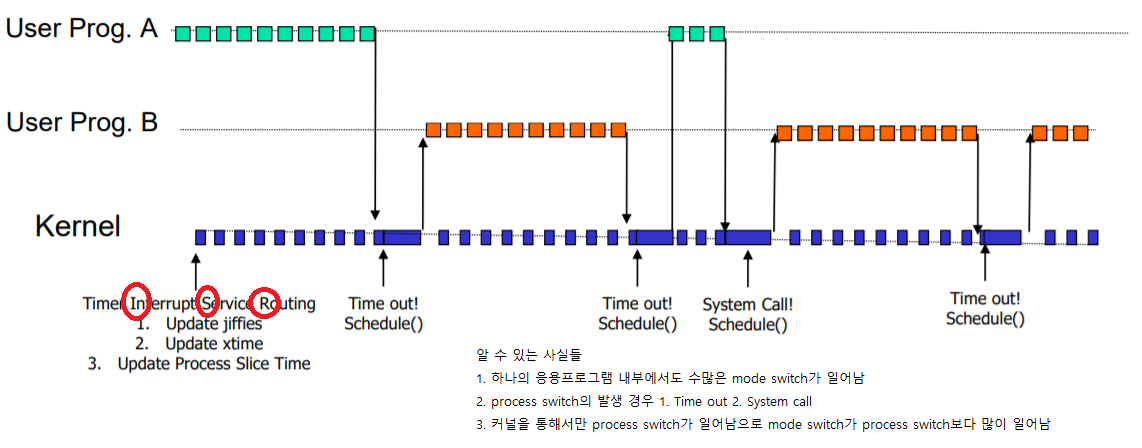 OS의 동작을 프로세스 처리에 대해서 시간 축으로 살펴 보면 동작에 대해서 좀 더 이해할 수 있다. 하나의 CPU가 수십 개의 프로세스를 동시에 처리하는 것처럼 보이는 건 스케줄링 덕분이다. 우선순위, 타임 슬라이스 등 다양한 정책이 있는데, 이건 성능에 큰 영향을 줄 수 있다. 여기서는 사용자 프로그램 2개 (User Prog. A, User Prog. B)가 어떻게 시스템 콜(Kernel)과 동작하여 하나의 CPU에서 처리되는지 시간 축으로 볼 수 있다.