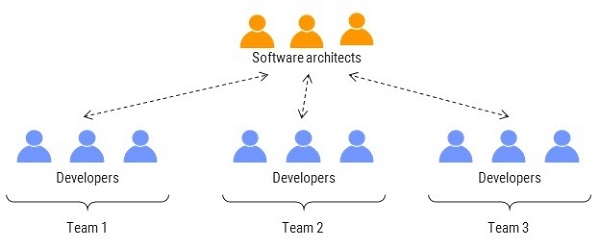 다른 개발 팀 (및 프로젝트)간에 구조를 공유하려는 경우 별도의 소프트웨어 설계자 팀과 함께 구조를 선택할 수 있다. 또한 많은 관점을 고려해야하는 복잡한 도메인에서 작업하는 경우, 이 구조를 적용 할 수도 있다. 그러나 이 경우 소프트웨어 아키텍트가 개발자와 긴밀하게 협력하고 지원하도록 해야한다. 애자일 방법론은 협업에 중점을 두므로 소프트웨어 아키텍트를 개발자와 분리하면 협업이 어려워진다. 결과적으로 개발 프로세스는 워터폴 모델에 가까워진다. 나는 개인적으로 팀 구성원 간의 의사 소통이 향상되기 때문에 각 개발 팀에 한 명의 소프트웨어 설계자가 존재하는 두 번째 변형을 선호한다. 선임 아키텍트(High level architects)는 여전히 서로 협력 할 수 있다 (꼭 그렇게 해야 한다).