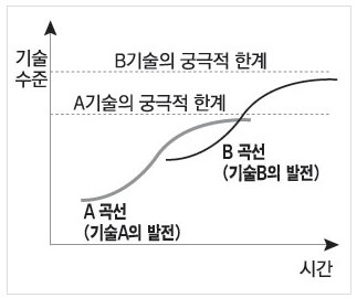 이 내용은 기술의 변화에 따른 혁신 과정의 그래프를 떠올리게 했다. 아래 그림과 같이 기술 A에서 B로 넘어가는 모습에서 기술이 달라지는 것이다. 이 때에는 위의 예에서 라면 구조 혹은 기술 또는 2가지 모두 바뀌는 것일 것이다. 기억나는 경우는 TV 혹은 스마트 폰의 경우이다. 특히, TV는 드라마틱 했다. 브라운관 TV에서는 플랫 브라운관 TV가 득세 할 때, LG 혹은 일본 TV가 전세게 1위를 하고 있었지만 LCD TV로 기술이 넘어가면서 삼성이 1위가 되기 시작했었다.