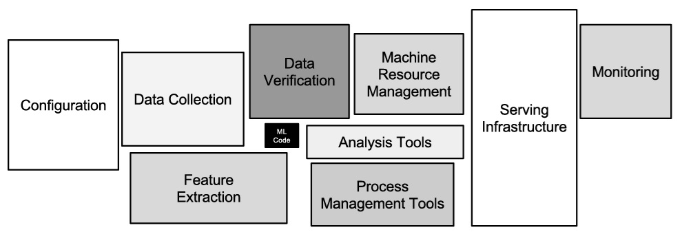Machine Learning(ML) 기술이 발전하면서 빠르게 기존 시스템과 통합이 이루어 지고 있다. LLM도 단순히 사람들이 ChatGPT와 같은 서비스를 사용하는 것을 넘어서서 Cloud를 통해서 여러 시스템과 통합이 이루어 지고 있다. 아래 그림데로 많은 ML 시스템에서 실제로 학습이나 예측에 사용되는 코드가 극히 일부에 불과하다는 것이 이미 알려져 있다[1]. 이러한 관점에서 기존의 여러 기술들이 ML 기술들과 통합되어야 한다. 이러한 관점에서 숨겨진 기술 부채(Hidden Technical Debt in Machine Learning)가 많을 수 있다.